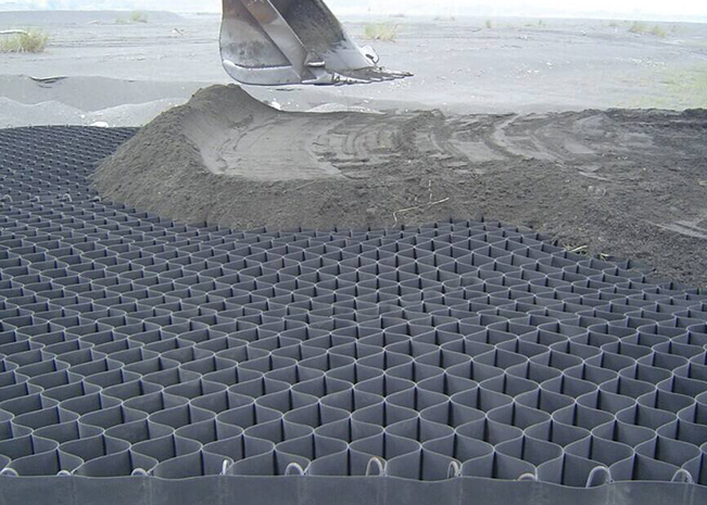 土工格室是由高強度的HDPE或PP共聚料寬帶,經過強力焊接或鉚接而形成的一片網狀格室結構。它伸縮自如,運輸時可縮疊起來,使用時張開并又充填土石或混凝土料,構成具有強大側向限制和大剛度的結構體。它可用來做為墊層,處理軟弱地基增大地基的承載能力,也可鋪設在坡面上構成坡面防護結構,還可以用來建造支擋結構等。